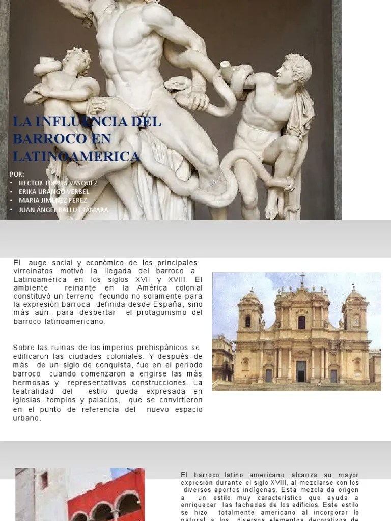 Desarrollada durante el perodo de las colonias espaolas y portuguesas en amrica latina, entre los s. Por lo que hizo que este alcanzara su mayor expresión durante el siglo xviii, al mezclarse con los diversos aportes indígenas. El arte barroco vino al continente americano por medio de los españoles;. Por lo que hizo que este alcanzara su mayor expresión durante el siglo xviii, al mezclarse con los diversos aportes indígenas.